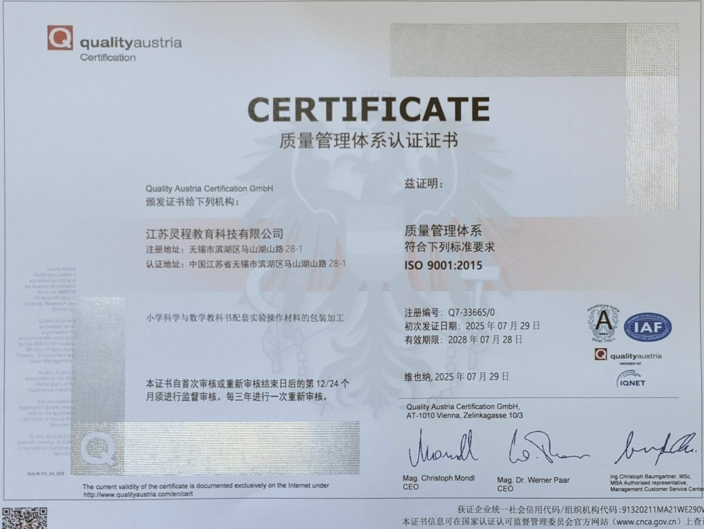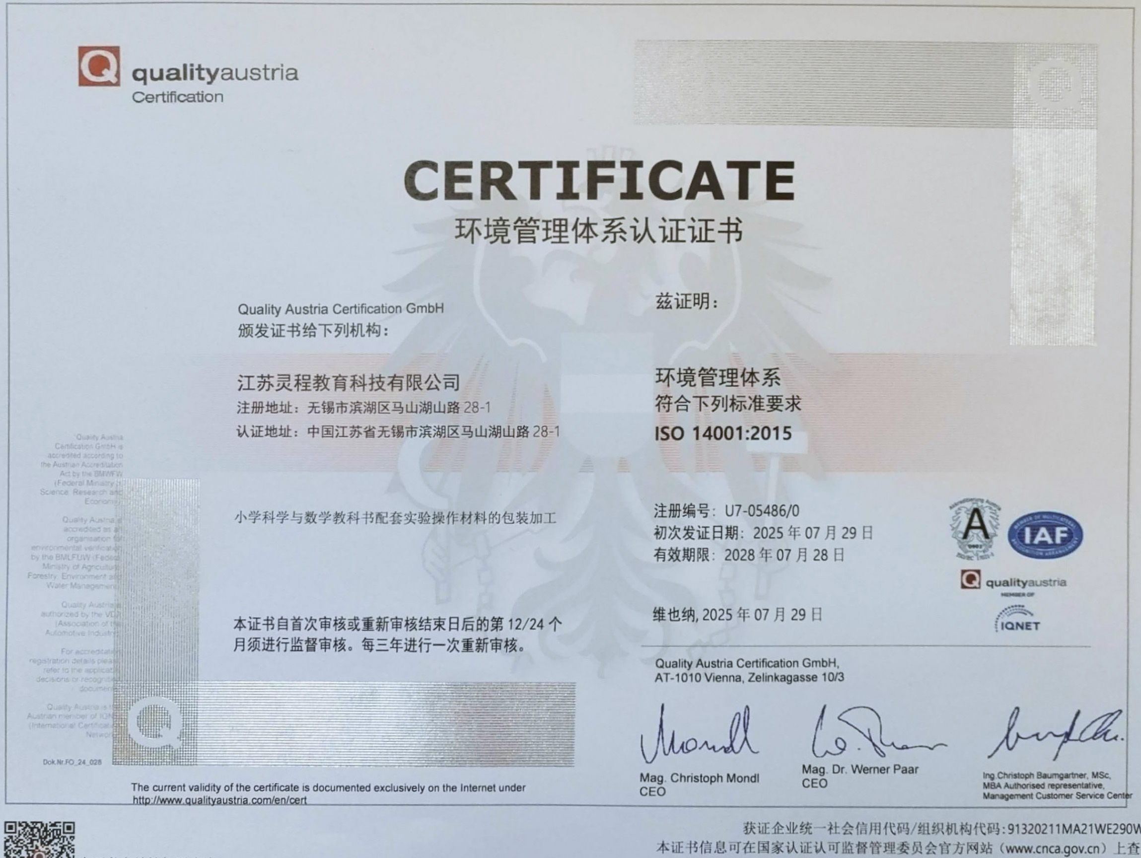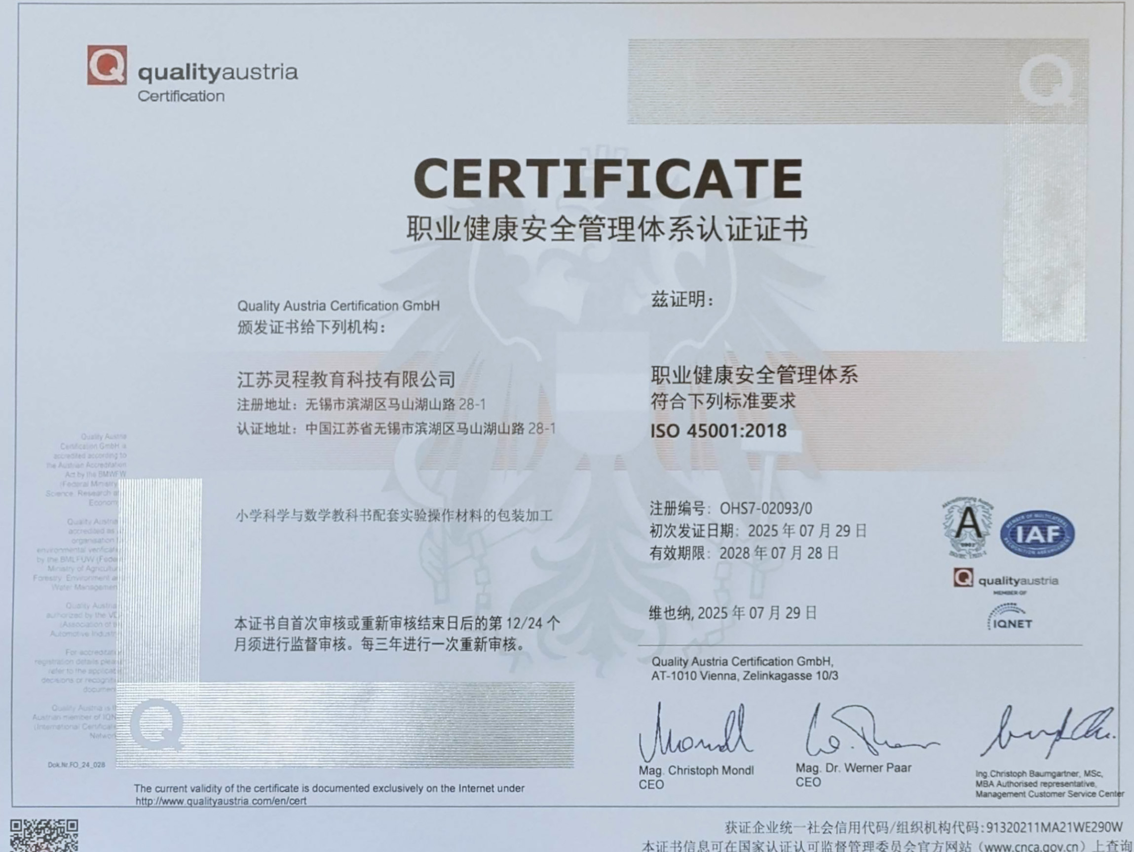 公司通过IS09001国际质量管理体系认证,IS045001职业健康安全管理体系认证,ISO14001环境管理体系认证。